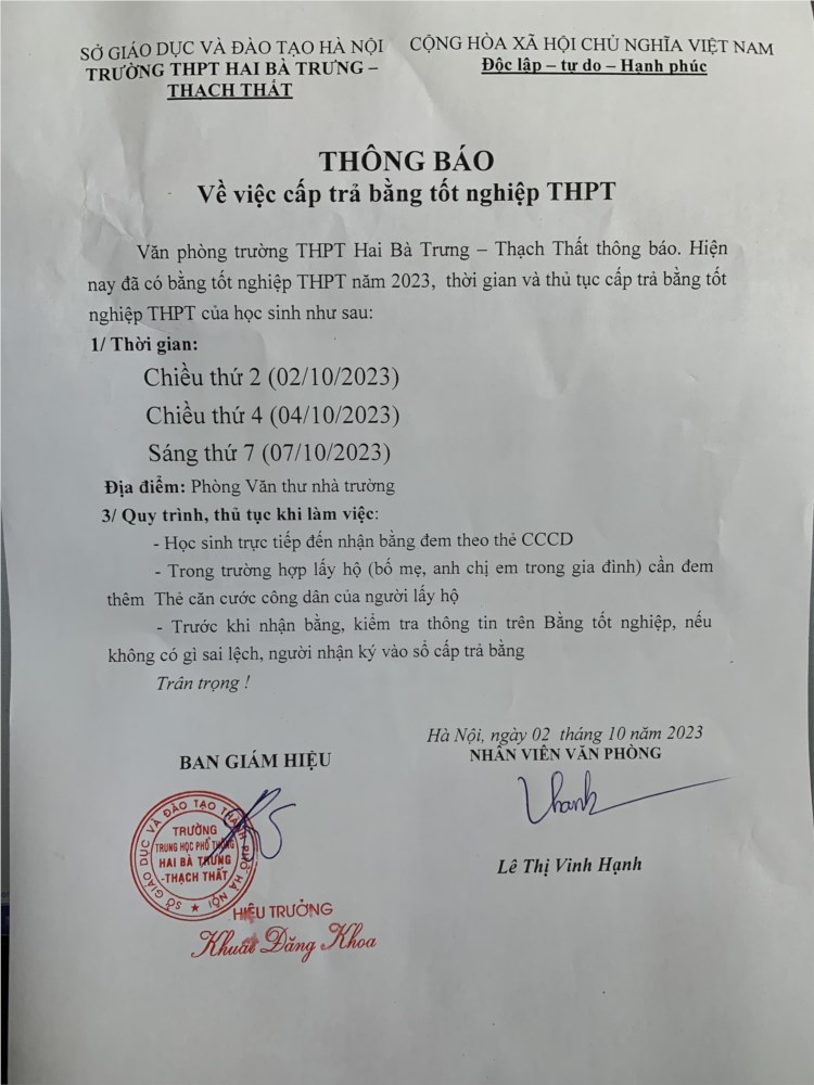 Khi đi nhận Bằng Tốt nghiệp hoặc rút hồ sơ, học bạ học sinh mang theo căn cước công dân. Học sinh cần kiểm tra kĩ thông tin và kí vào sổ cấp phát Bằng.